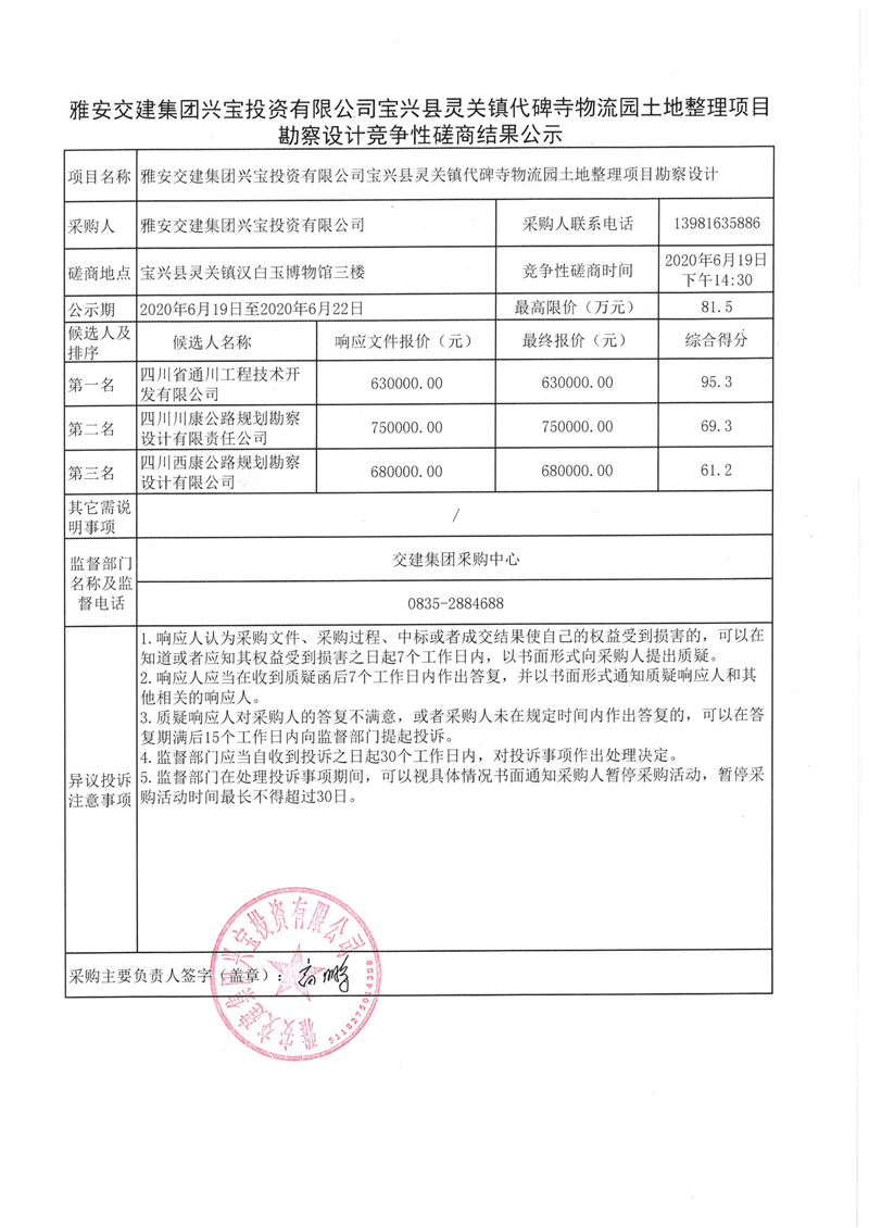 雅安交建集團(tuán)興寶投資有限公司寶興縣靈關(guān)鎮(zhèn)代碑寺物流園土地整理項(xiàng)目勘察設(shè)計(jì)競(jìng)爭(zhēng)性磋商結(jié)果公示