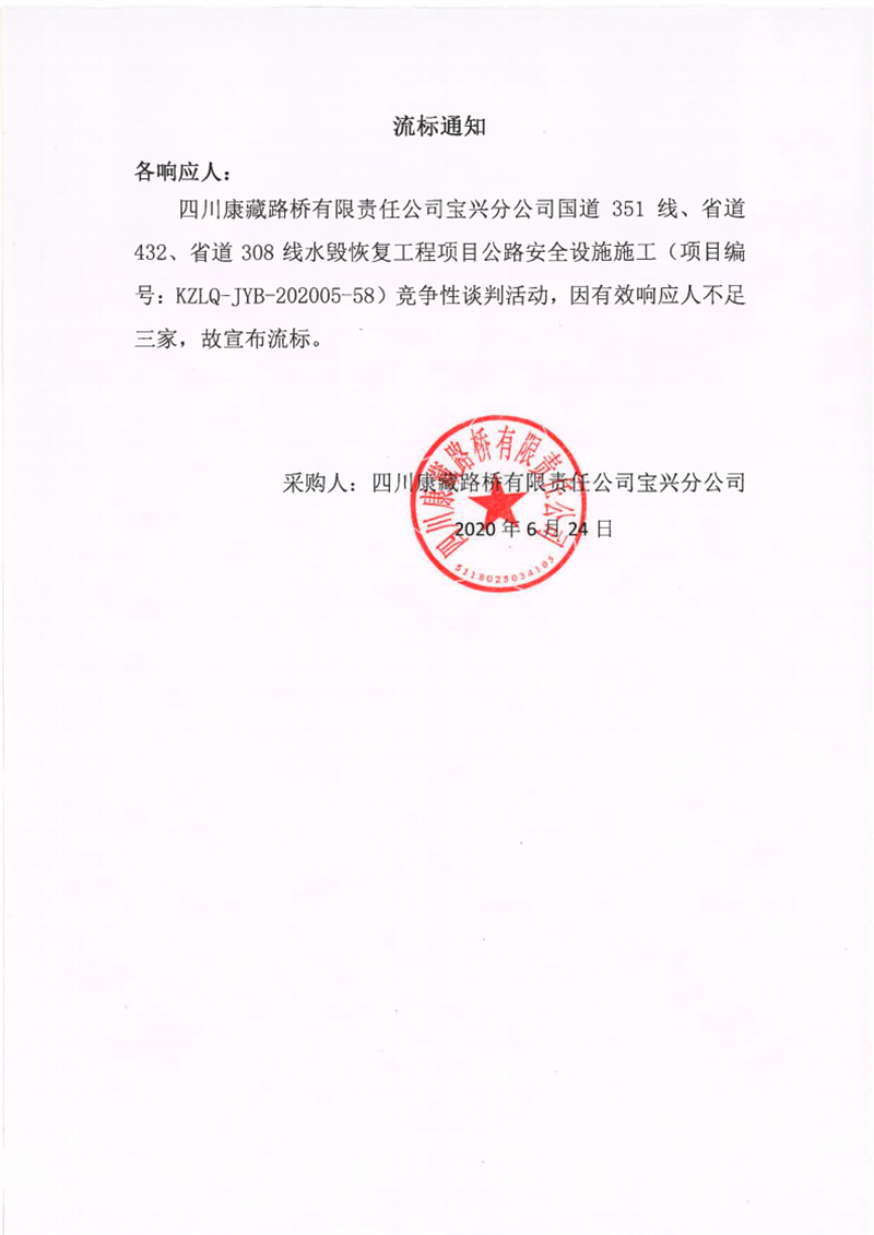 四川康藏路橋有限責任公司寶興分公司國道351線、省道432線、省道308線水毀修復工程項目公路安全設(shè)施施工流標通知