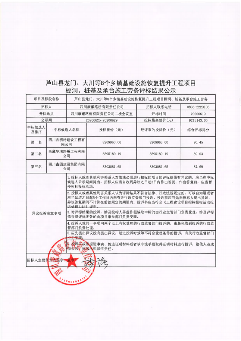四川康藏路橋有限責(zé)任公司蘆山縣龍門、大川等8個鄉(xiāng)鎮(zhèn)基礎(chǔ)設(shè)施恢復(fù)提升工程項目棚洞、樁基及承臺施工勞務(wù)評標(biāo)結(jié)果公示