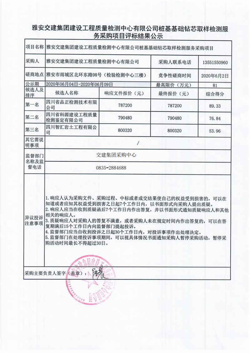 雅安交建集團(tuán)建設(shè)工程質(zhì)量檢測中心有限公司樁基基礎(chǔ)鉆芯取樣檢測服務(wù)采購項目評標(biāo)結(jié)果公示