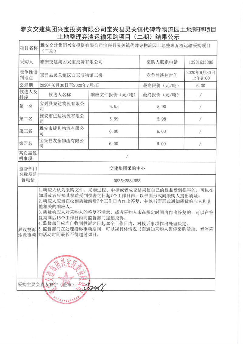 雅安交建集團(tuán)興寶投資有限公司寶興縣靈關(guān)鎮(zhèn)代碑寺物流園土地整理項目土地整理棄渣運(yùn)輸采購項目(二期)結(jié)果公示
