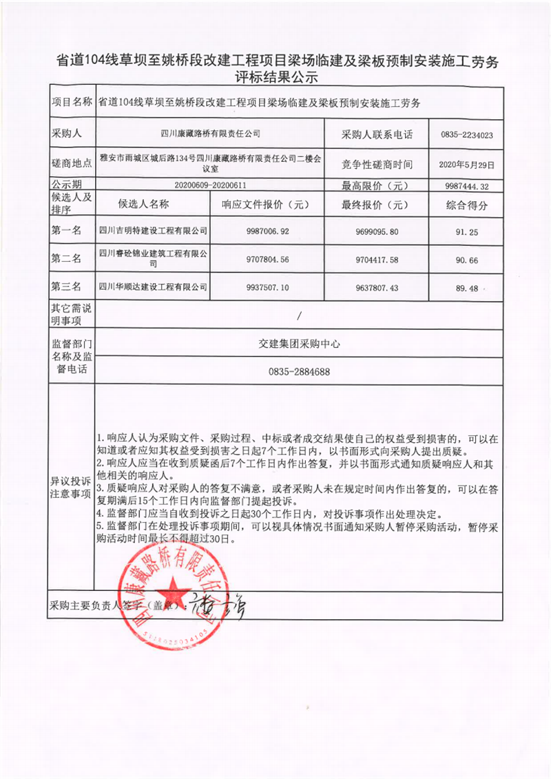 四川康藏路橋有限責(zé)任公司省道104線草壩至姚橋段改建工程項目梁場臨建及梁板預(yù)制安裝施工勞務(wù)評標(biāo)結(jié)果公示