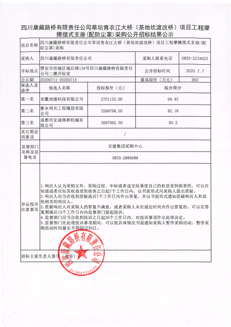 四川康藏路橋有限責(zé)任公司草壩青衣江大橋(茶地坎渡改橋)項(xiàng)目工程摩擦擺式支座(配防塵罩)采購(gòu)公開招標(biāo)結(jié)果公示