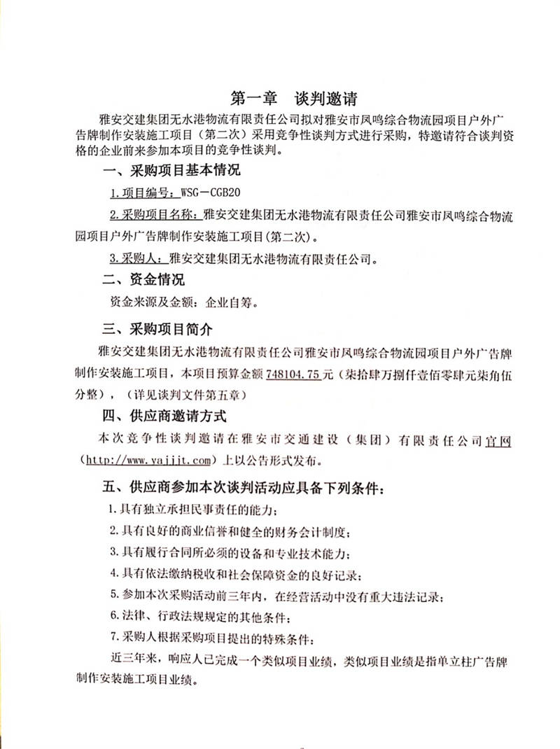 雅安交建集團(tuán)無(wú)水港物流有限責(zé)任公司雅安市鳳鳴綜合物流園項(xiàng)目戶外廣告牌制作安裝施工項(xiàng)目(第二次)競(jìng)爭(zhēng)性談判公告