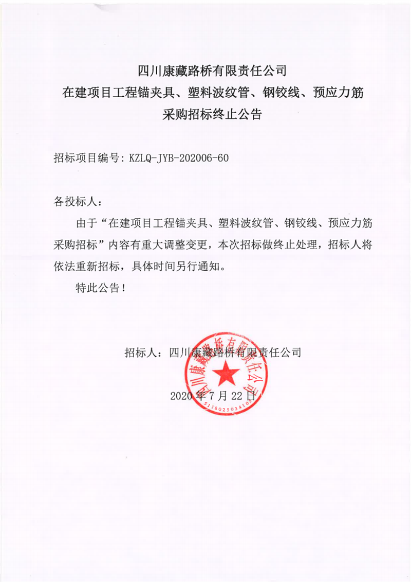四川康藏路橋有限責任公司在建項目工程錨夾具、塑料波紋管、鋼鉸線、預應力筋采購招標終止公告