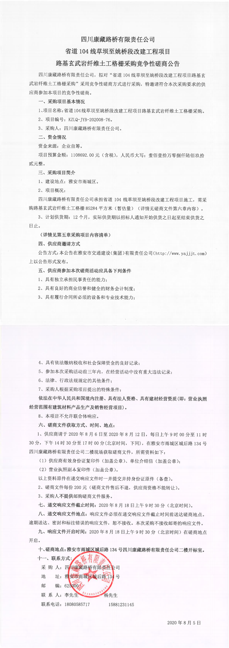 四川康藏路橋有限責(zé)任公司省道104線草壩至姚橋段改建工程項(xiàng)目路基玄武巖纖維土工格柵采購競爭性磋商公告