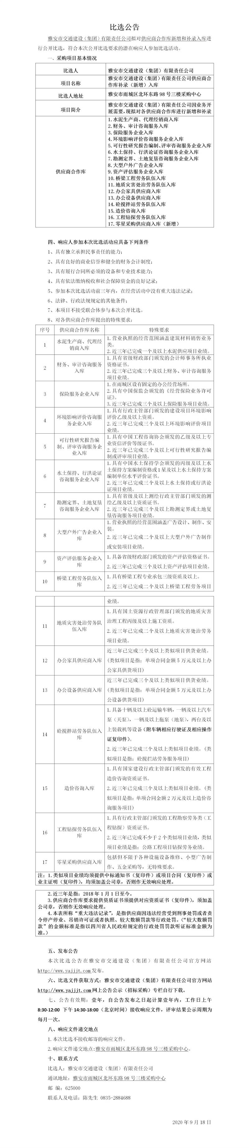 雅安市交通建設(shè)(集團)有限責(zé)任公司供應(yīng)商合作庫補錄(新增)入庫比選公告