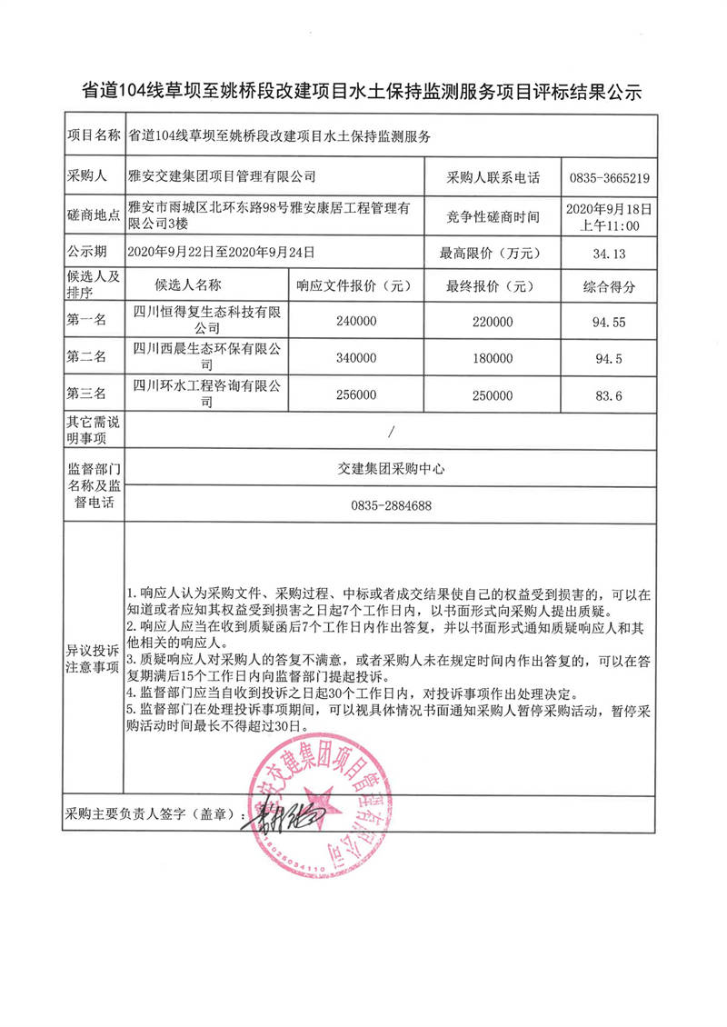 雅安交建集團項目管理有限公司省道104線草壩至姚橋段改建項目水土保持監(jiān)測服務(wù)項目評標結(jié)果公示