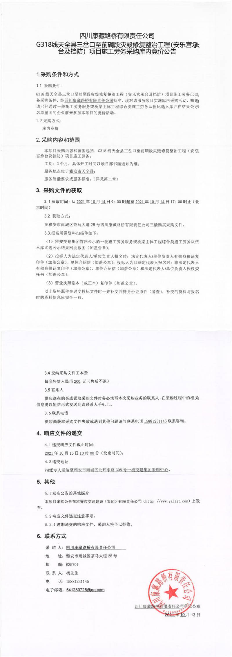 四川康藏路橋有限責(zé)任公司G318線天全縣三岔口至前碉段災(zāi)毀修復(fù)整治工程(安樂宮承臺(tái)及擋防)項(xiàng)目施工勞務(wù)采購(gòu)庫(kù)內(nèi)競(jìng)價(jià)公告