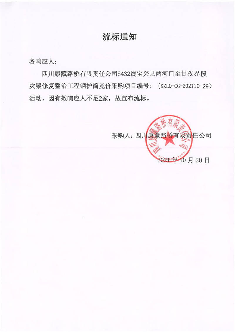 四川康藏路橋有限責(zé)任公司S432線寶興縣兩河口至甘孜界段災(zāi)毀修復(fù)整治工程鋼護(hù)筒競(jìng)價(jià)采購(gòu)流標(biāo)通知