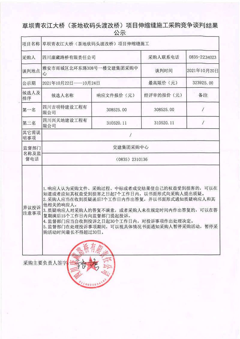 四川康藏路橋有限責任公司草壩青衣江大橋(茶地坎碼頭渡改橋)項目伸縮縫施工采購競爭談判結(jié)果公示