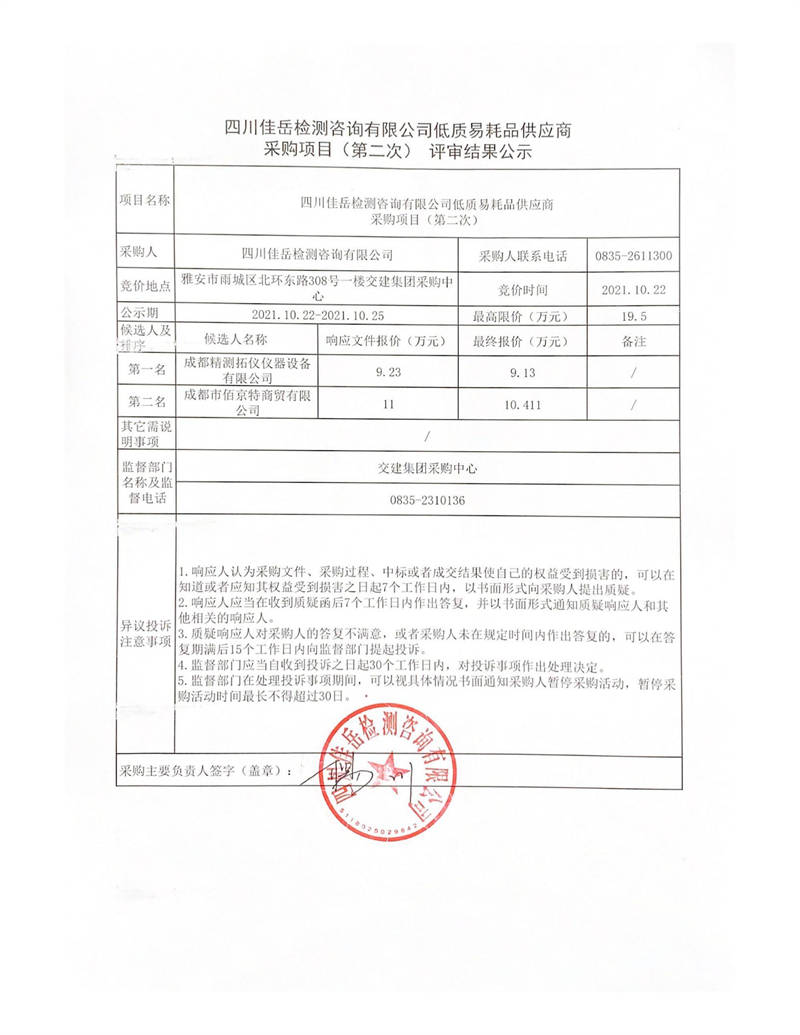 四川佳岳檢測咨詢有限公司低質(zhì)易耗品供應商采購項目(第二次)評審結(jié)果公示