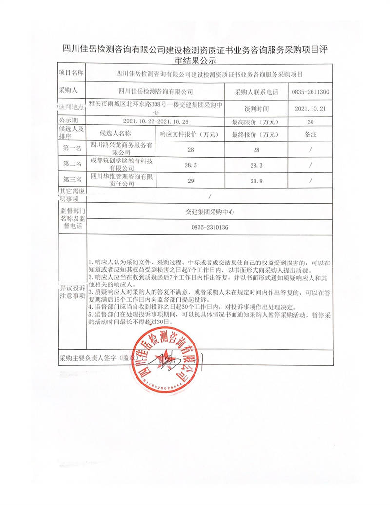 四川佳岳檢測咨詢有限公司建設檢測資質(zhì)證書業(yè)務咨詢服務采購項目評審結(jié)果公示