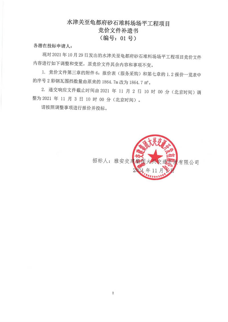 雅安交建集團大興交通開發(fā)有限公司水津關至龜都府砂石堆料場場平工程項目競價文件補遺書(編號:01號)