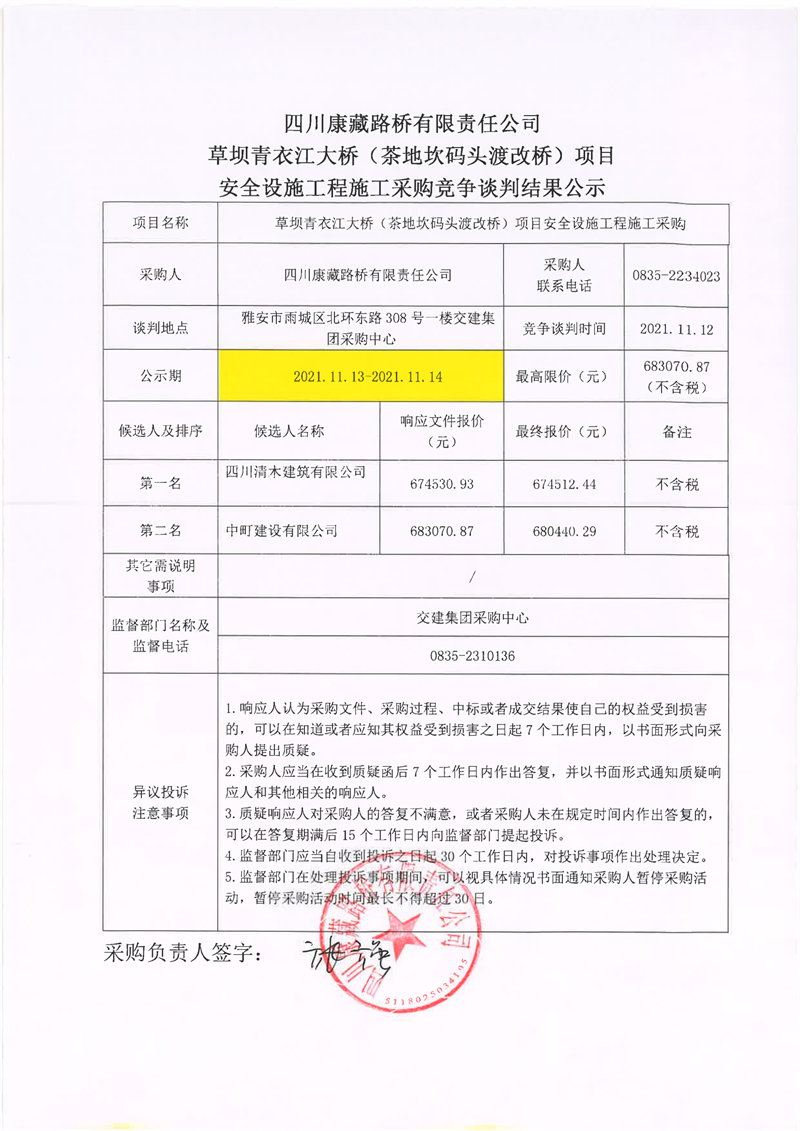 四川康藏路橋有限責(zé)任公司草壩青衣江大橋(茶地坎碼頭渡改橋)項目安全設(shè)施施工采購競爭談判結(jié)果公示
