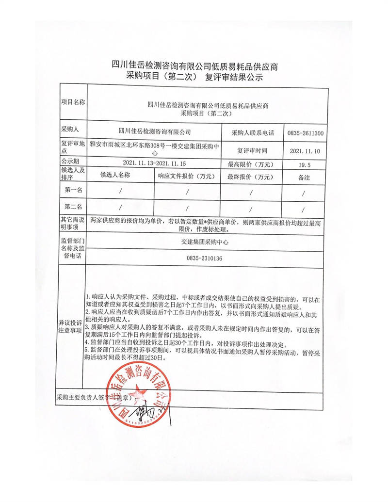 四川佳岳檢測咨詢有限公司低質(zhì)易耗品供應商采購項目(第二次)復評審結果公示