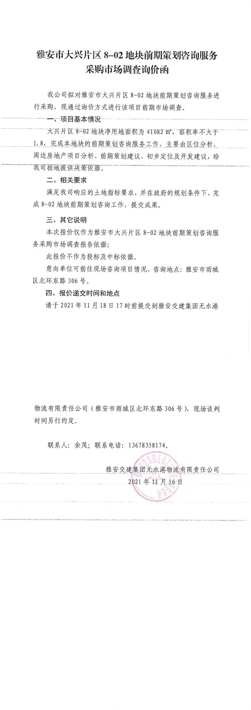 雅安交建集團(tuán)無(wú)水港物流有限責(zé)任公司雅安市大興片區(qū)8-02地塊前期策劃咨詢服務(wù)采購(gòu)市場(chǎng)調(diào)查詢價(jià)函