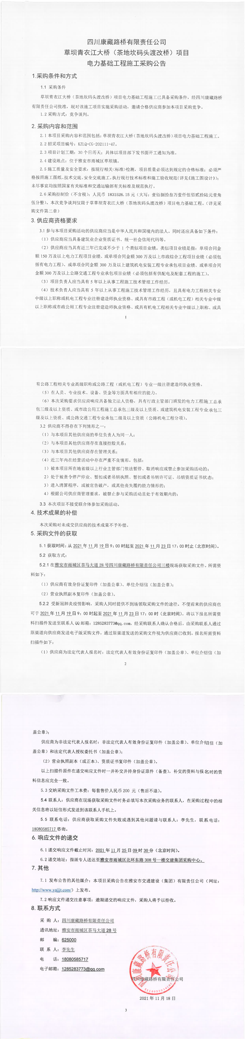 四川康藏路橋有限責(zé)任公司草壩青衣江大橋(茶地坎碼頭渡改橋)項(xiàng)目電力基礎(chǔ)工程施工采購公告