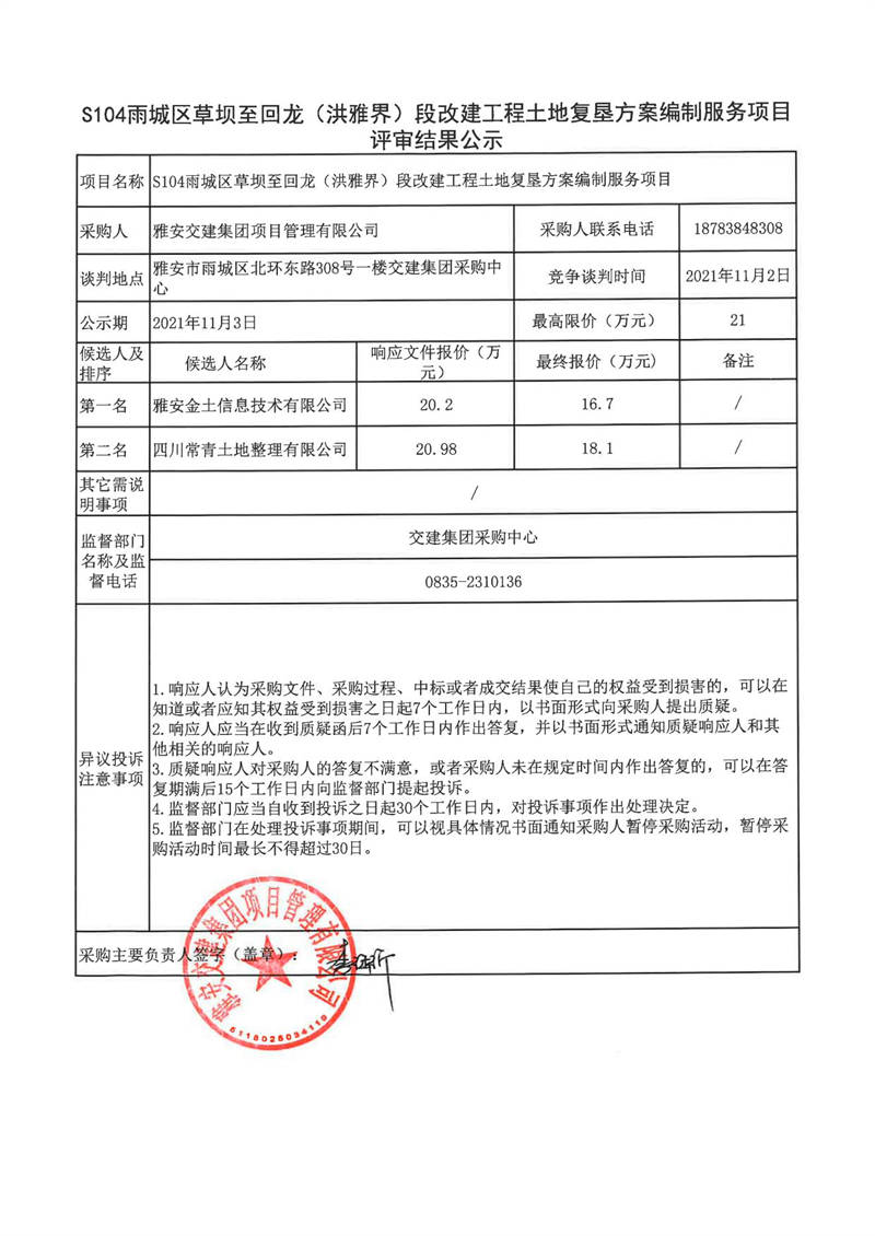 雅安交建集團(tuán)項(xiàng)目管理有限公司S104雨城區(qū)草壩至回龍(洪雅界)段改建工程土地復(fù)墾方案編制服務(wù)項(xiàng)目評(píng)審結(jié)果公示