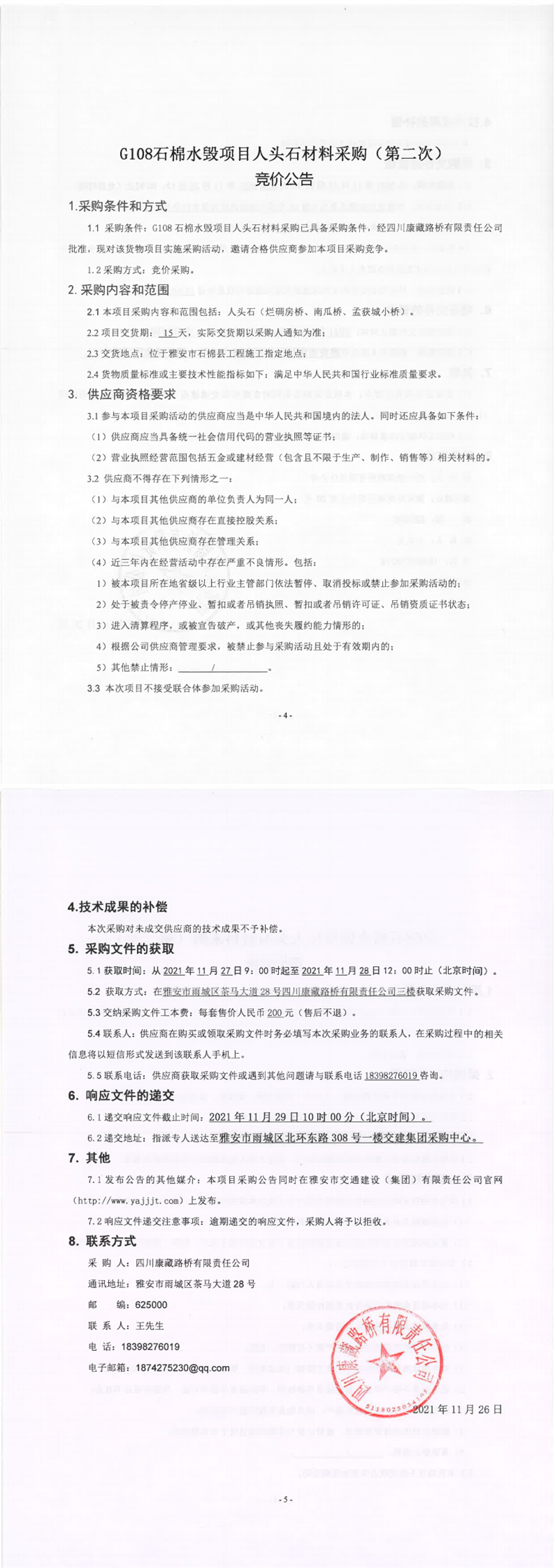 四川康藏路橋有限責(zé)任公司G108石棉水毀項(xiàng)目人頭石材料采購(第二次)競價(jià)公告