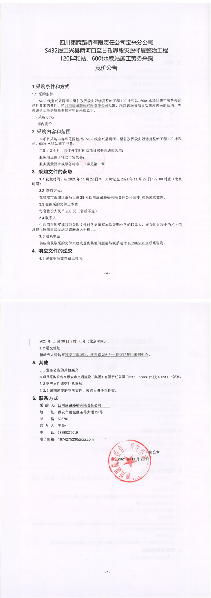 四川康藏路橋有限責(zé)任公司S432線寶興縣兩河口至甘孜界段災(zāi)毀修復(fù)整治工程120拌合站、600t水穩(wěn)站施工勞務(wù)采購競價公告