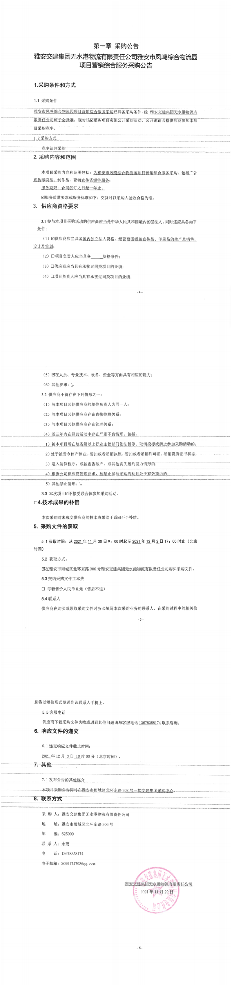 雅安交建集團無水港物流有限責任公司雅安市鳳鳴綜合物流園項目營銷綜合服務采購公告