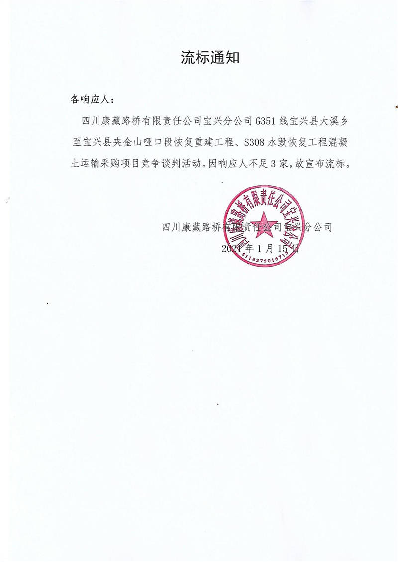 四川康藏路橋有限責(zé)任公司寶興分公司G351線寶興縣大溪鄉(xiāng)至寶興縣夾金山啞口段恢復(fù)重建工程、S308水毀恢復(fù)工程混凝土運(yùn)輸采購項(xiàng)目流標(biāo)通知