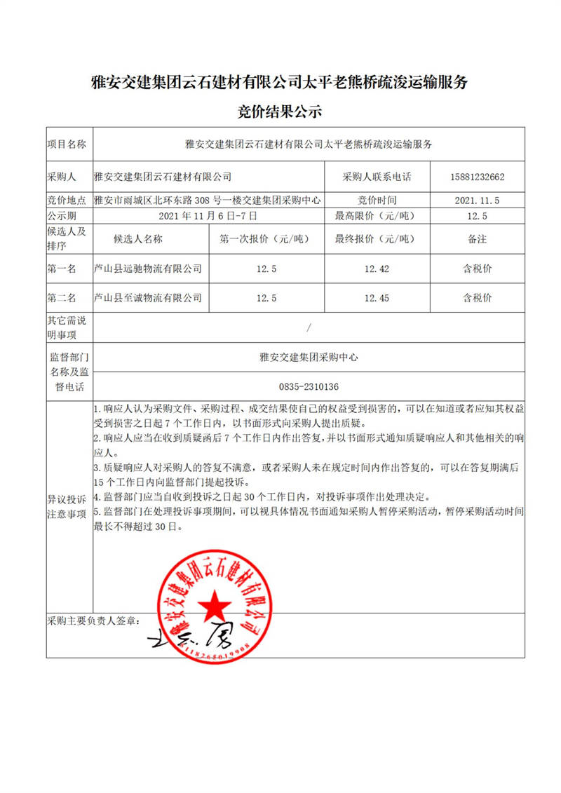 雅安交建集團云石建材有限公司太平老熊橋疏浚運輸服務競價結果公示