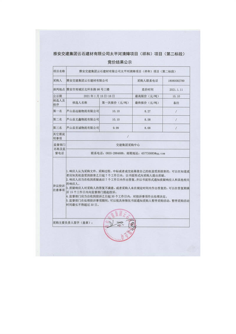 雅安交建集團云石建材有限公司太平河清障項目(王河壩)項目(第一標段)競價結果公示