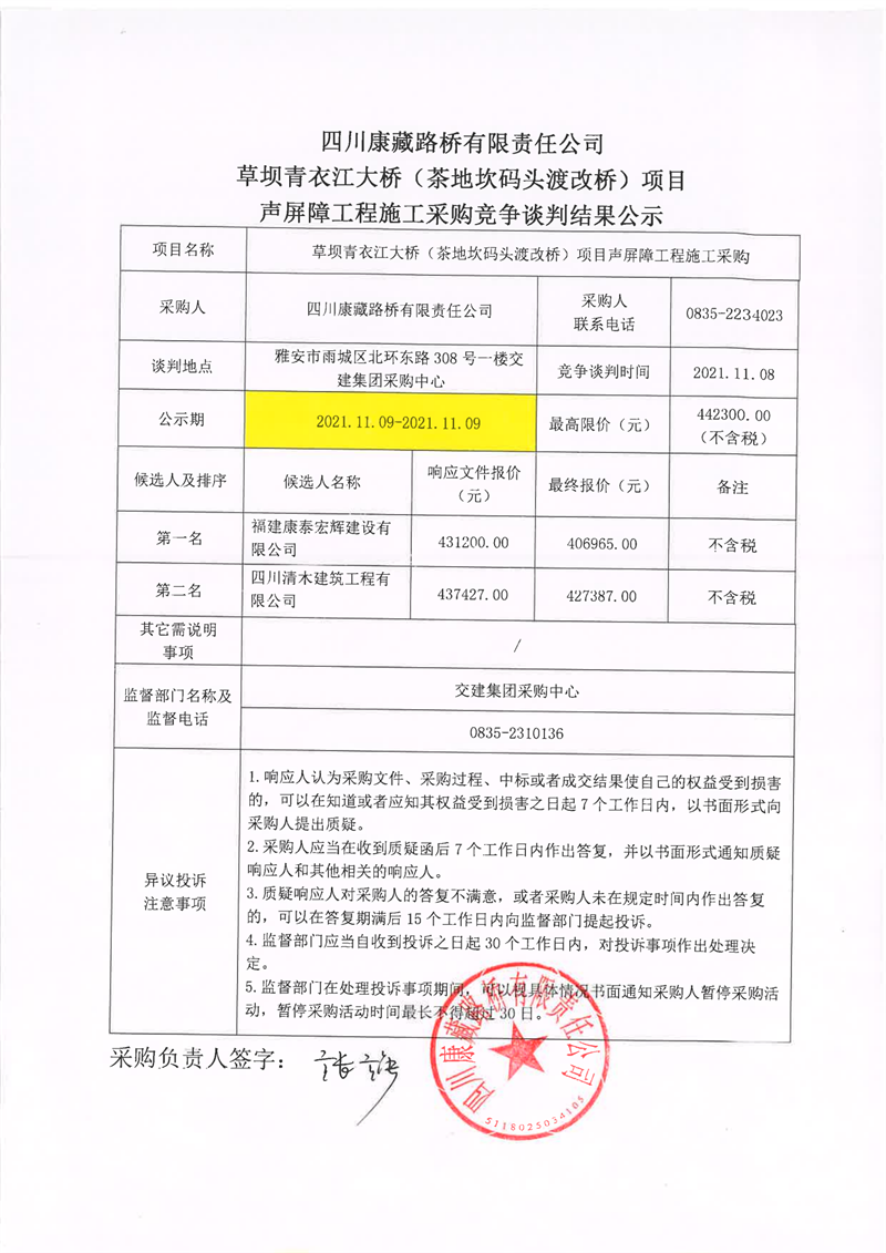 四川康藏路橋有限責任公司草壩青衣江大橋(茶地坎碼頭渡改橋)項目聲屏障工程施工采購競爭談判結果公示