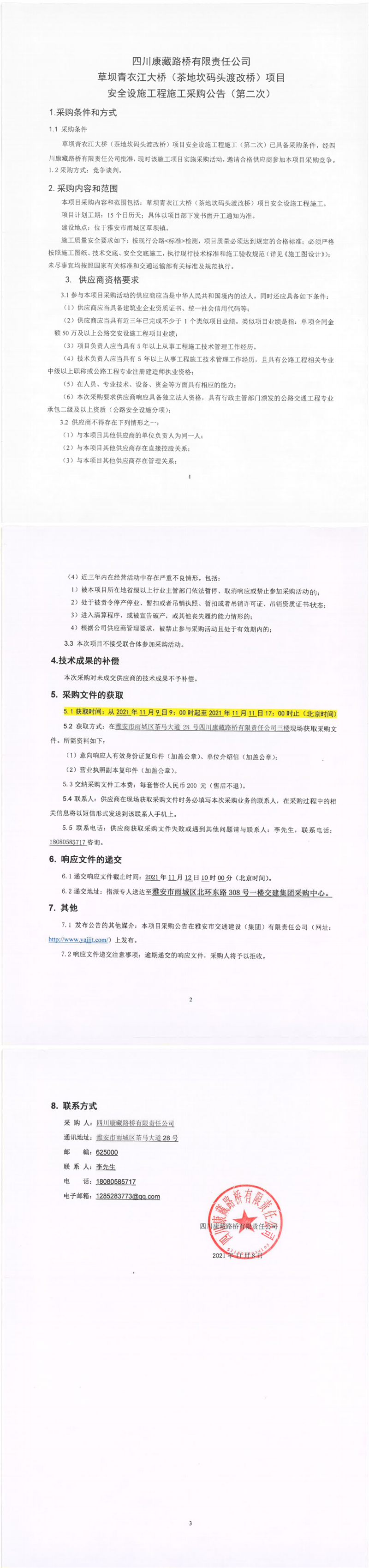 四川康藏路橋有限責(zé)任公司草壩青衣江大橋(茶地坎碼頭渡改橋)項(xiàng)目安全設(shè)施工程施工采購公告(第二次)