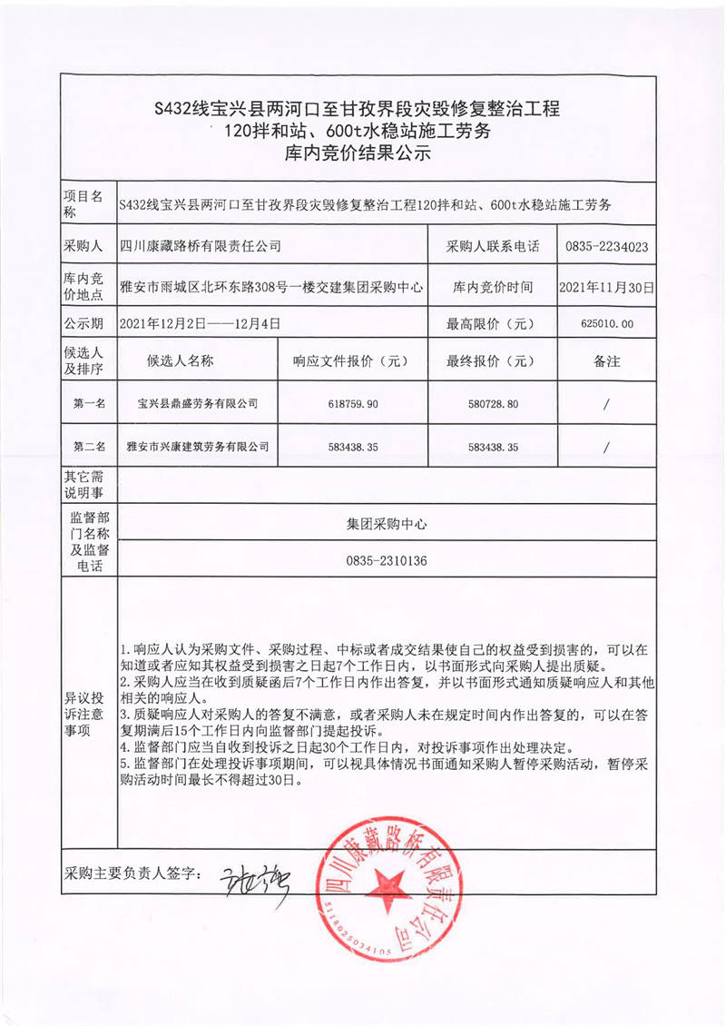 四川康藏路橋有限責(zé)任公司S432線寶興縣兩河口至甘孜界段災(zāi)毀修復(fù)整治工程120拌和站、600t水穩(wěn)站施工勞務(wù)庫(kù)內(nèi)競(jìng)價(jià)結(jié)果公示