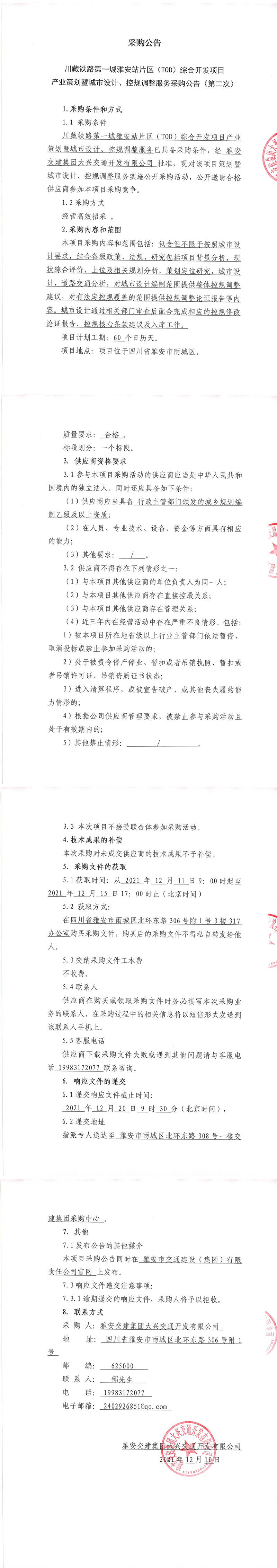 雅安交建集團大興交通開發(fā)有限公司川藏鐵路第一城雅安站片區(qū)(TOD)綜合開發(fā)項目產(chǎn)業(yè)策劃暨城市設計、控規(guī)調整服務采購公告(第二次)