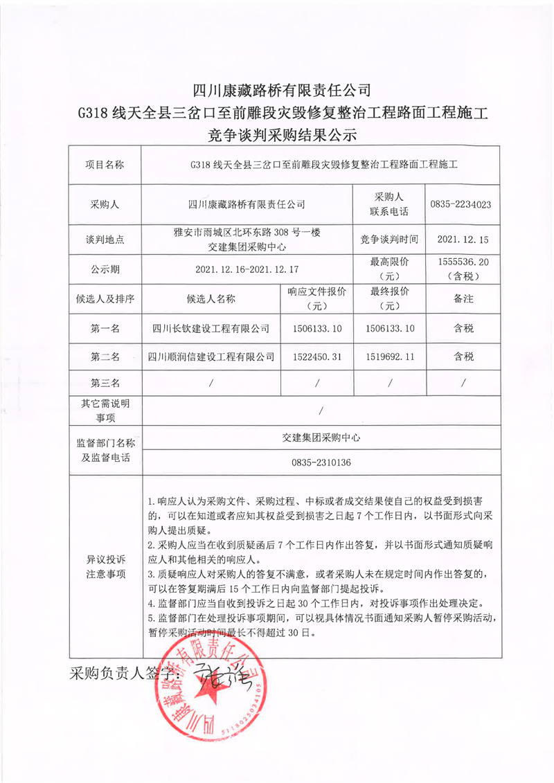 四川康藏路橋有限責(zé)任公司G318線天全縣三岔口至前碉段災(zāi)毀修復(fù)整治工程路面工程施工競(jìng)爭(zhēng)談判采購(gòu)結(jié)果公示