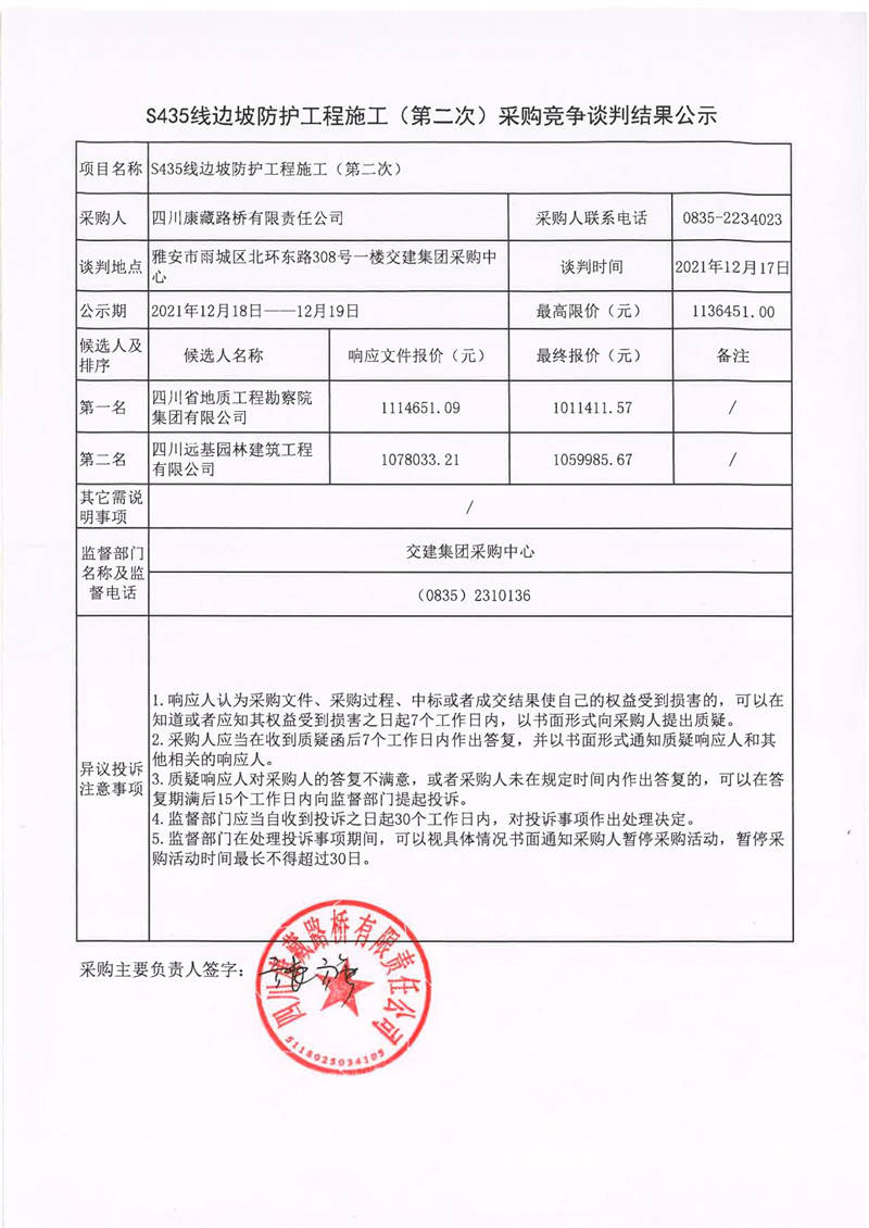 四川康藏路橋有限責(zé)任公司S435線邊坡防護(hù)工程施工(第二次)采購(gòu)競(jìng)爭(zhēng)談判結(jié)果公示