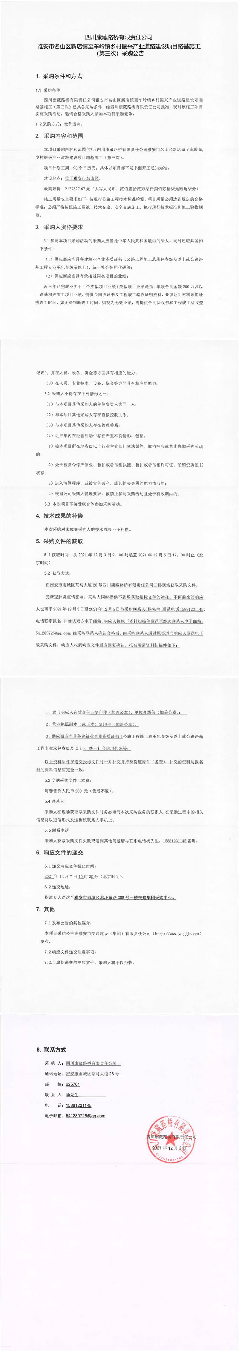 四川康藏路橋有限責(zé)任公司雅安市名山區(qū)新店鎮(zhèn)至車嶺鎮(zhèn)鄉(xiāng)村振興產(chǎn)業(yè)道路建設(shè)項(xiàng)目路基施工(第三次)采購(gòu)公告