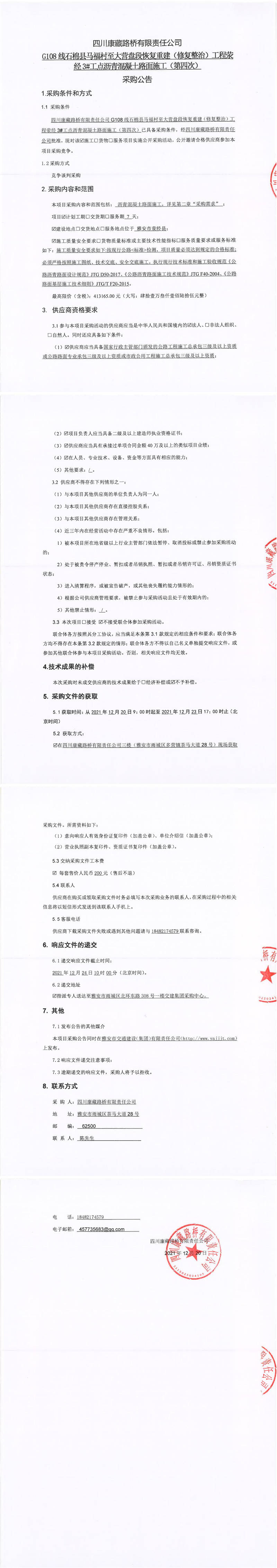四川康藏路橋有限責任公司G108線石棉縣馬福村至大營盤段恢復(fù)重建(修復(fù)整治)工程滎經(jīng)3#工點瀝青混凝土路面施工(第四次)采購公告
