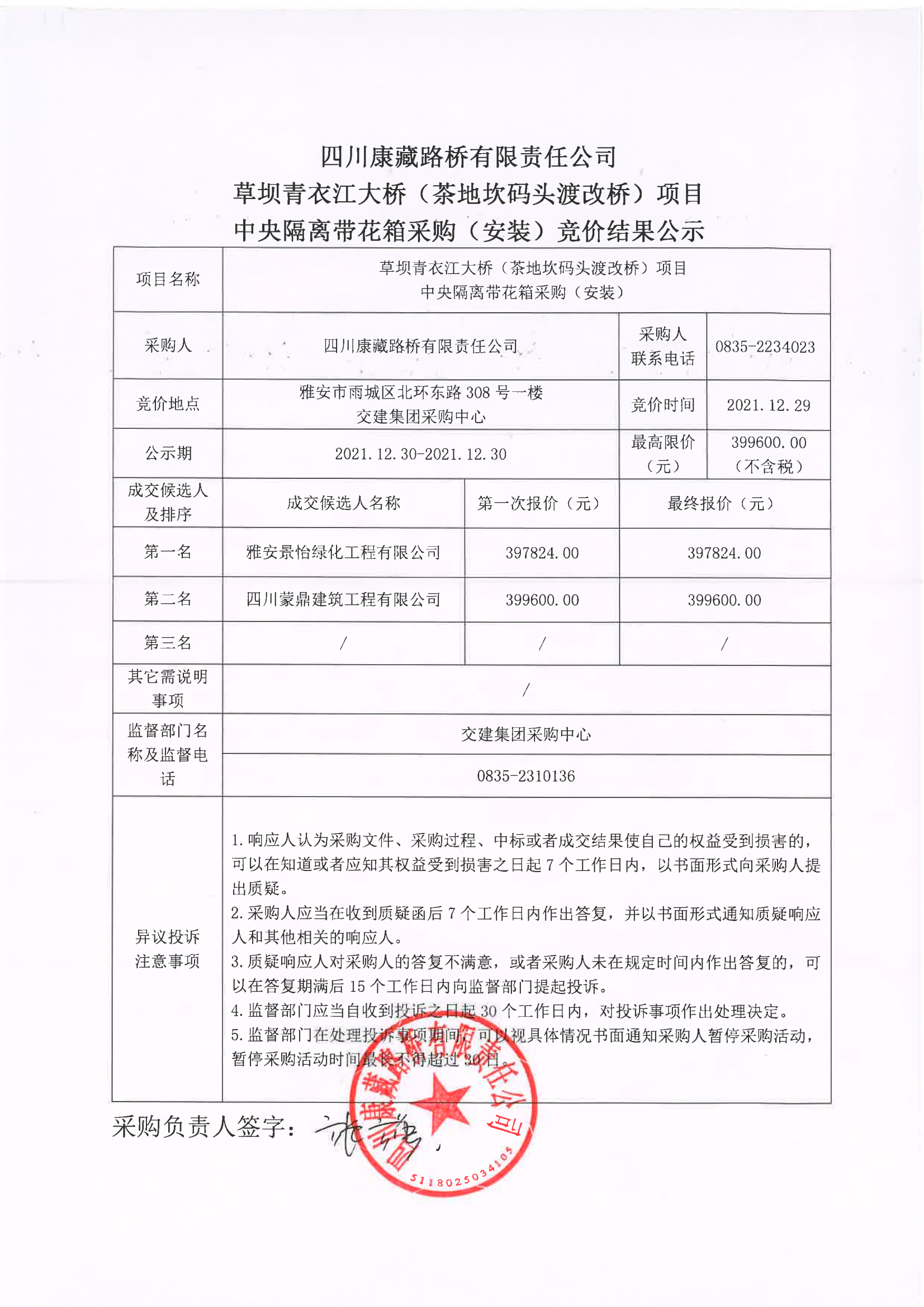 四川康藏路橋有限責任公司草壩青衣江大橋(茶地坎碼頭渡改橋)項目中央隔離帶花箱采購(安裝)競價結(jié)果公示