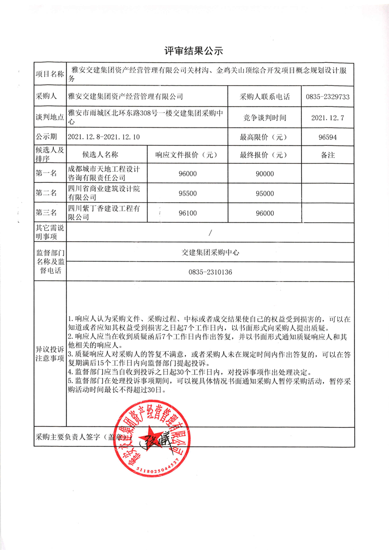 雅安交建集團(tuán)資產(chǎn)經(jīng)營管理有限公司關(guān)材溝、金雞關(guān)山頂綜合開發(fā)項(xiàng)目概念規(guī)劃設(shè)計(jì)服務(wù)評(píng)審結(jié)果公示