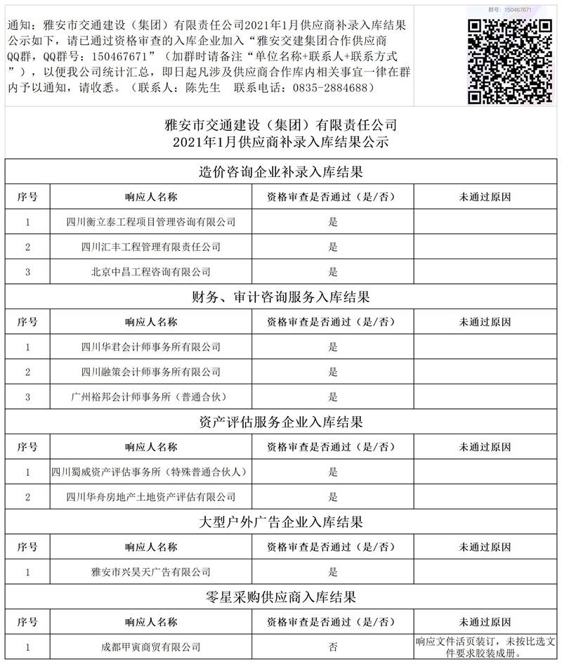 雅安市交通建設(shè)(集團)有限責任公司2021年1月供應(yīng)商補錄入庫結(jié)果公示