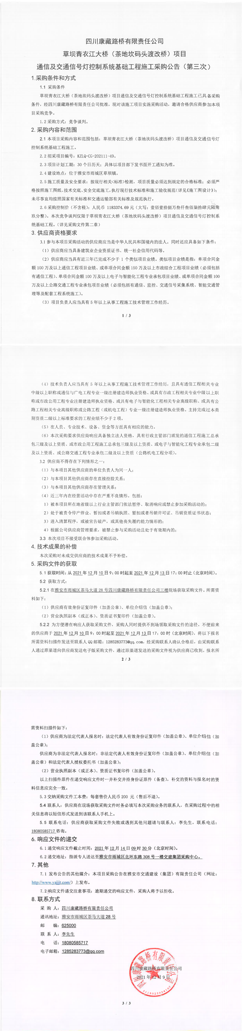 四川康藏路橋有限責(zé)任公司草壩青衣江大橋(茶地坎碼頭渡改橋)項(xiàng)目通信及交通信號(hào)燈控制系統(tǒng)基礎(chǔ)工程施工采購公告(第三次)