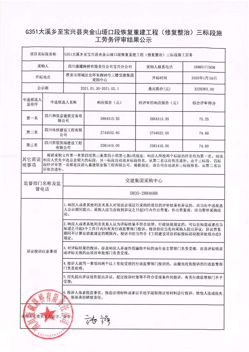 四川康藏路橋有限責任公司G351大溪鄉(xiāng)至寶興縣夾金山埡口段恢復重建工程(修復整治)三標段施工勞務評審結果公示