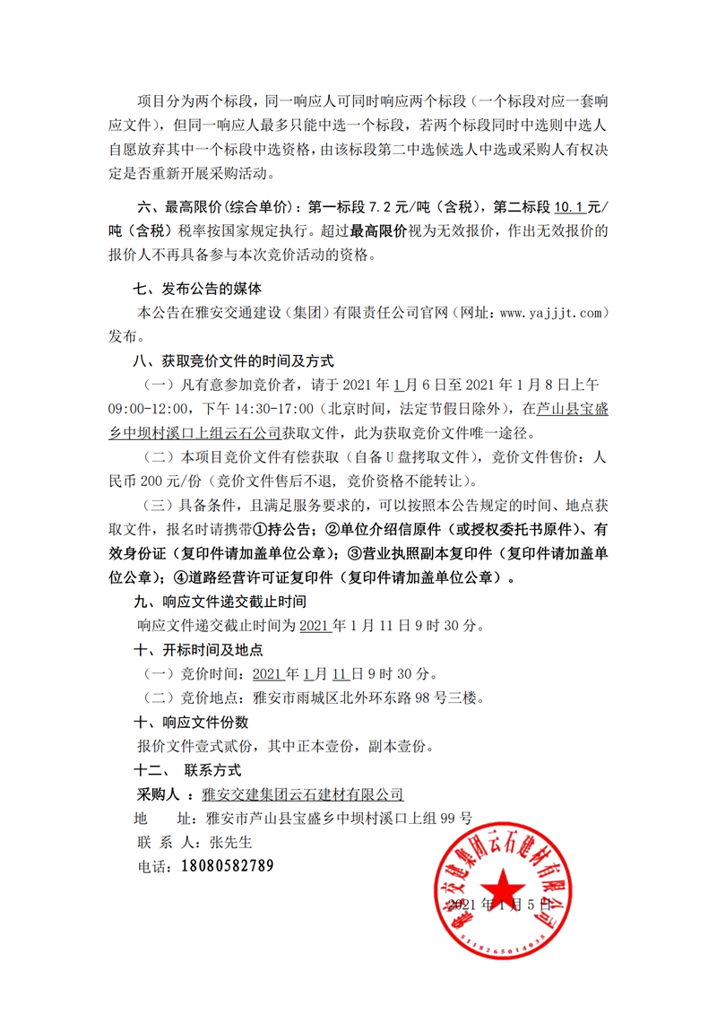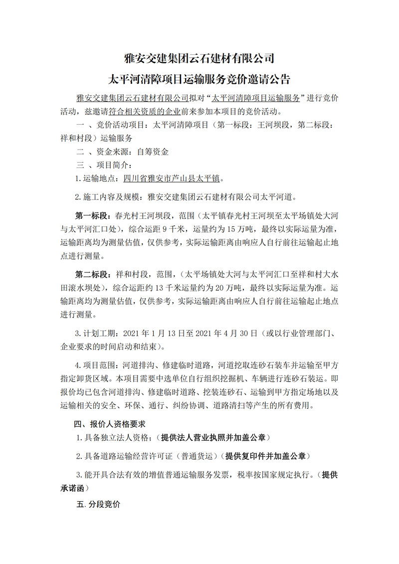 雅安交建集團(tuán)云石建材有限公司太平河清障項(xiàng)目運(yùn)輸服務(wù)競價(jià)邀請(qǐng)公告