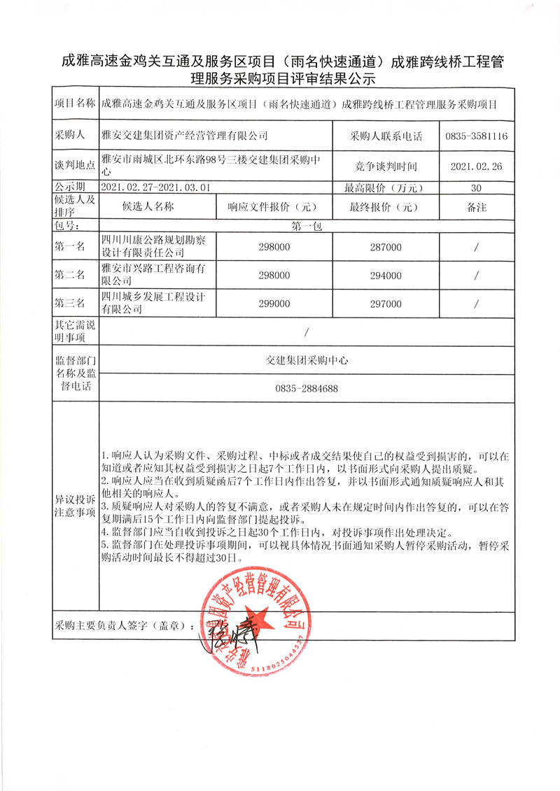 雅安交建集團(tuán)資產(chǎn)經(jīng)營管理有限公司成雅高速金雞關(guān)互通及服務(wù)區(qū)項(xiàng)目(雨名快速通道)成雅跨線橋工程管理服務(wù)采購項(xiàng)目評(píng)審結(jié)果公示