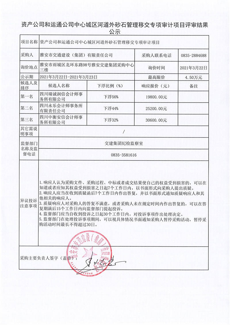 雅安市交通建設(shè)(集團(tuán))有限責(zé)任公司資產(chǎn)公司和運通公司中心城區(qū)河道外砂石管理移交專項審計項目評審結(jié)果公示
