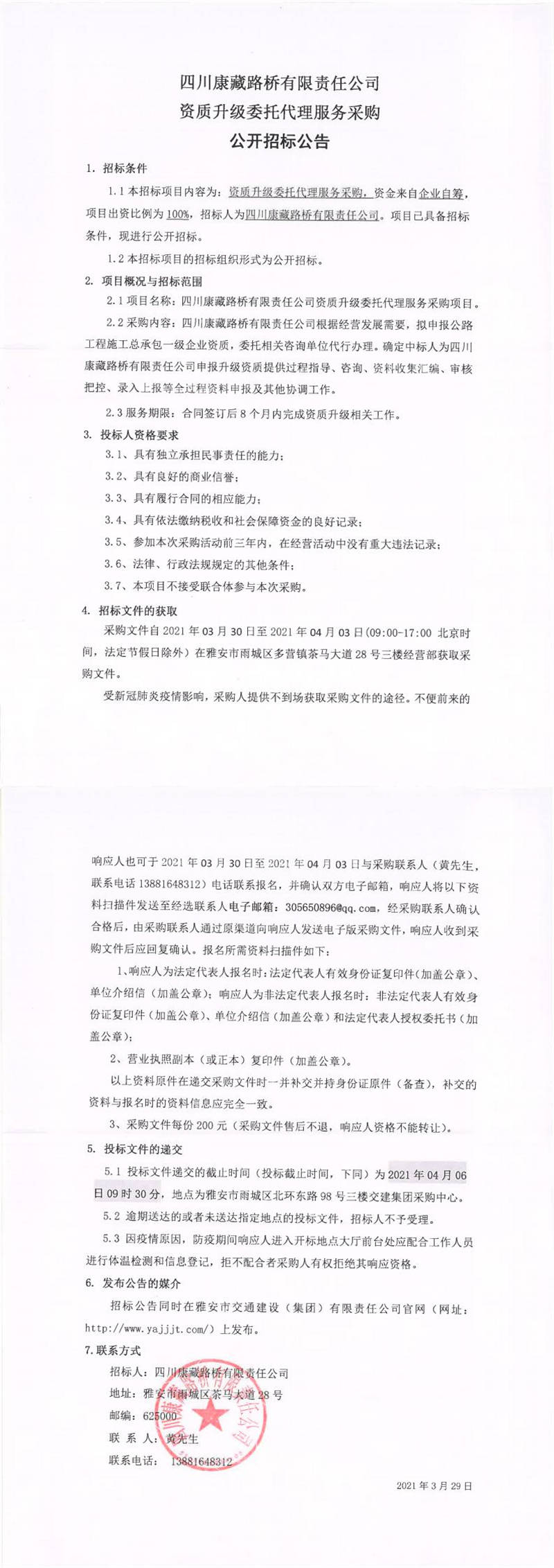 四川康藏路橋有限責(zé)任公司資質(zhì)升級委托代理服務(wù)采購公開招標公告