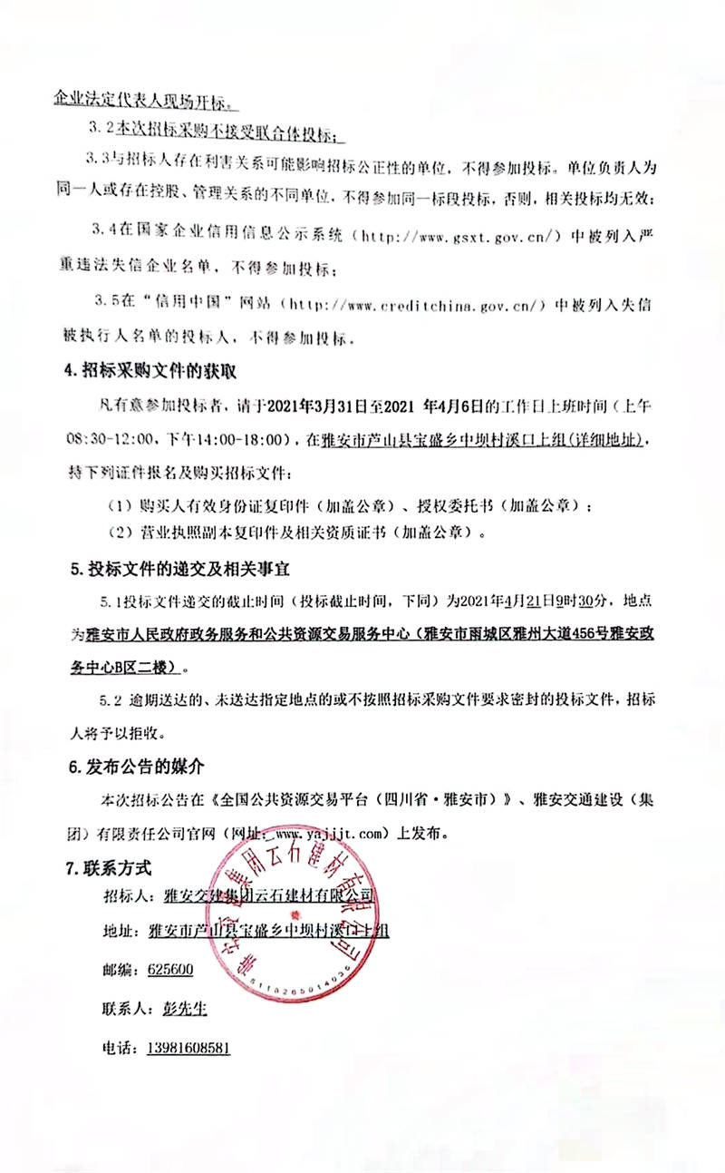 雅安交建集團云石建材有限公司日產(chǎn)10000噸砂石骨料生產(chǎn)項目招標采購公告