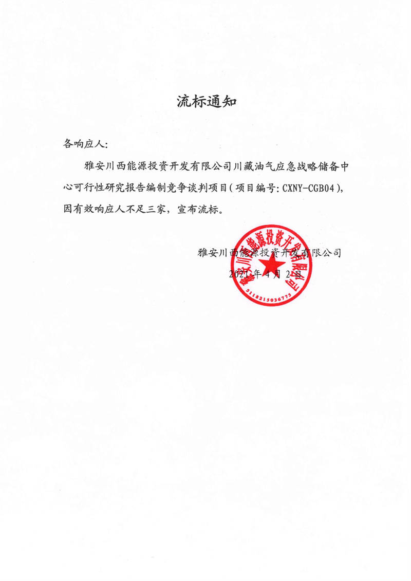 雅安川西能源投資開發(fā)有限公司川藏油氣應急戰(zhàn)略儲備中心可行性研究報告編制競爭談判項目流標通知