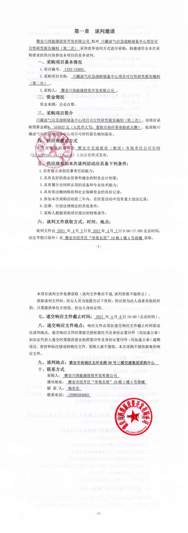 雅安川西能源投資開(kāi)發(fā)有限公司川藏油氣應(yīng)急戰(zhàn)略儲(chǔ)備中心項(xiàng)目可行性研究報(bào)告編制(第二次)競(jìng)爭(zhēng)談判公告