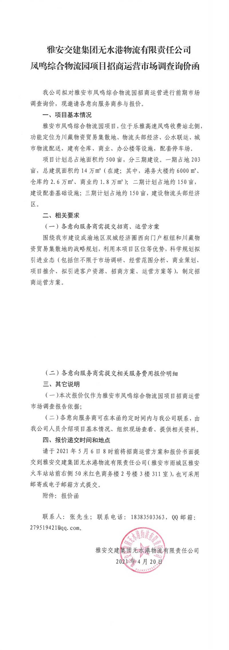 雅安交建集團無水港物流有限責任公司鳳鳴綜合物流園項目招商運營市場調(diào)查詢價函